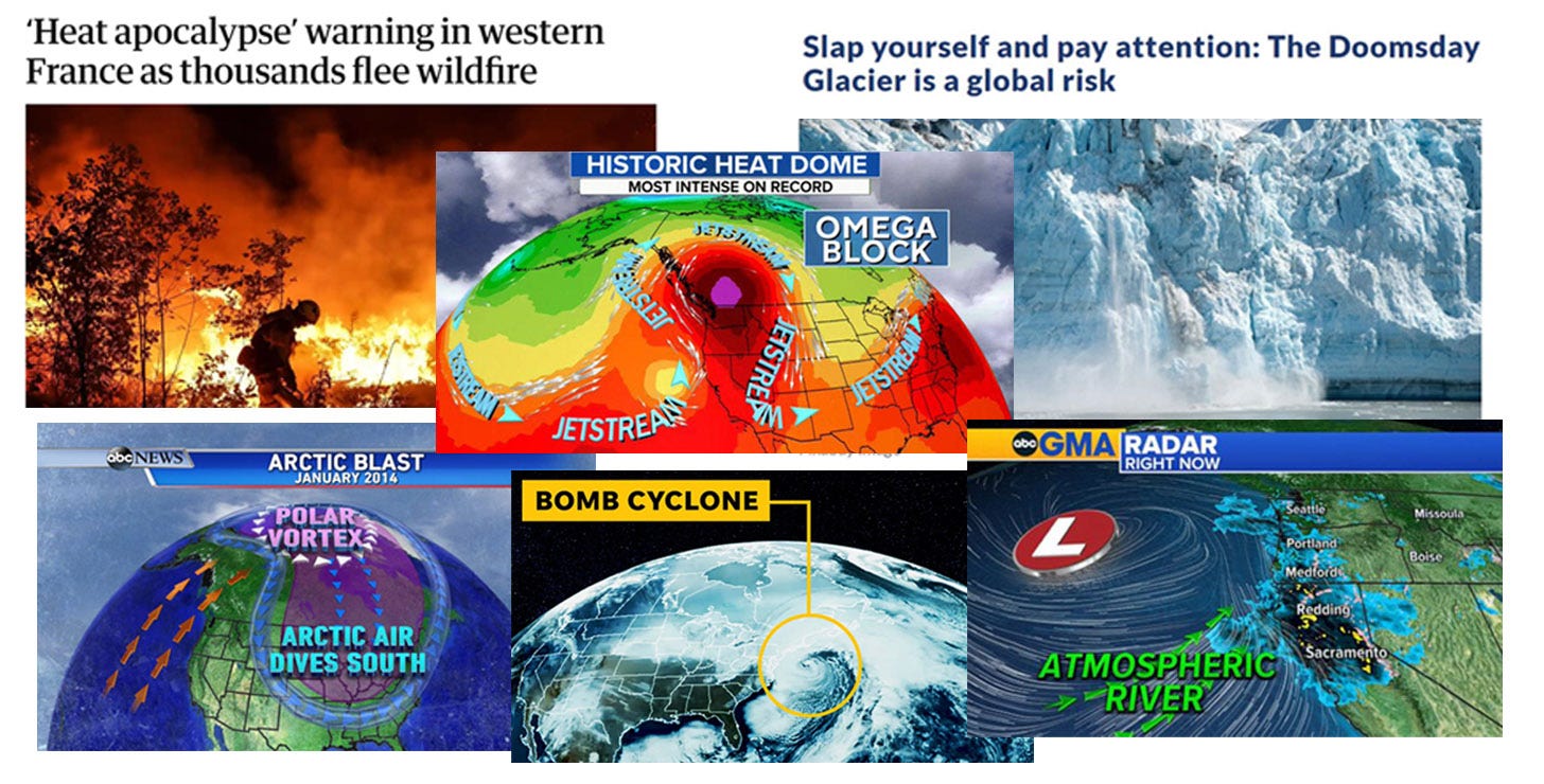 (Plausible explanation) We are experiencing extreme weather because the Jet Stream has become unstable and it’s basically swerving all over the road. The Gulf Stream is supposed to keep the Jet Stream stable, but because global warming is heating up the ocean, the Gulf Stream is slowing down and getting weaker, and it is in danger of collapsing.